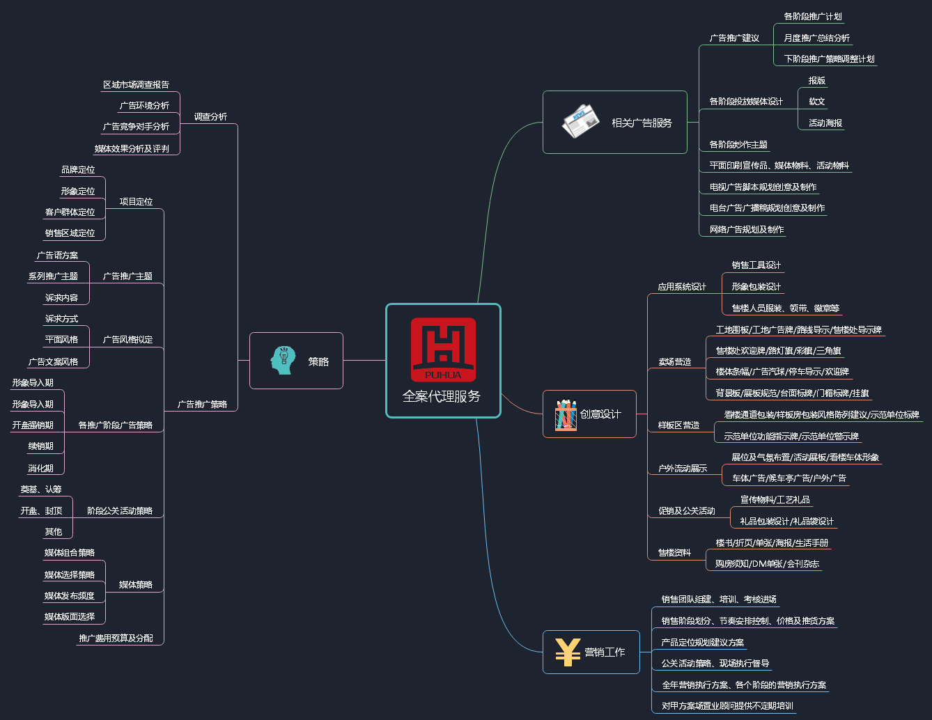 全案代理服務全案代理服務內容**部分:策略類內容A、區域市場調查報告/廣告環境分析/廣告競爭對手分析/媒體效果分析及評判B、廣告推廣策略1、項目定位項目階段 品牌定位/形象定位/客戶群體定位/銷售區域定位2、廣告推廣主題廣告語方案/系列推廣主題/訴求內容3、廣告風格擬定訴求方式/...